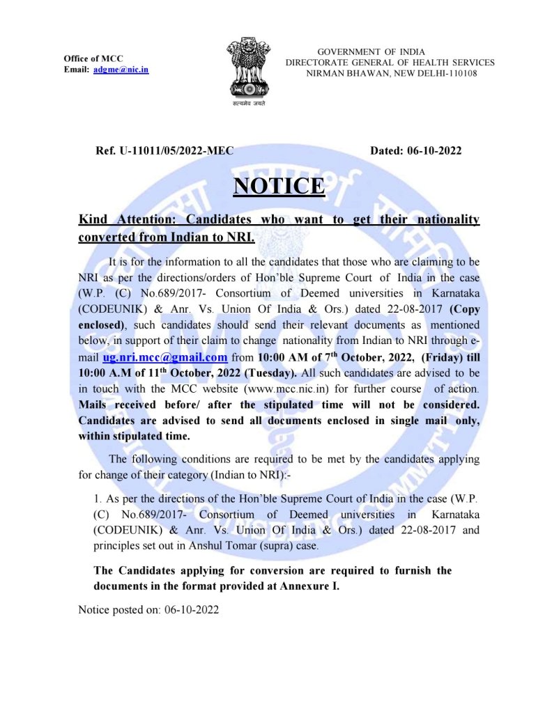 The notice released reads,β It is for the information to all the candidates that those who are claiming to be NRI as per the directions/orders of Honβble Supreme Court of India in the case (W.P. (C) No.689/2017- Consortium of Deemed universities in Karnataka (CODEUNIK) & Anr. Vs. Union of India & Ors.) dated 22-08-2017 (Copy enclosed), such candidates should send their relevant document in support of their claim to change nationality from Indian to NRI through email ug.nri.mcc@gmail.com from 10:00 AM of 7th October 2022, (Friday) till 10:00 A.M of 11th October 2022 (Tuesday).